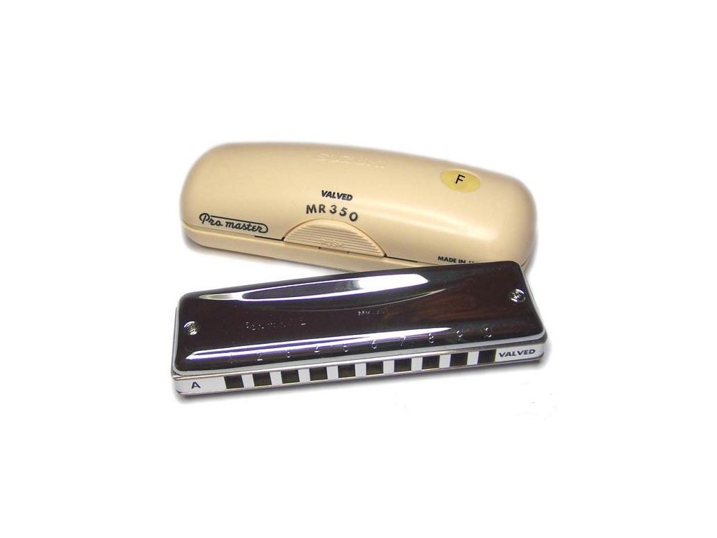 Foukací harmonika Suzuki Promaster MR-350, Deluxe, 10 kanálků, diatonická, ladění: F, rozměry: 100x27x20 (mm), váha: 91g (126g včetně pouzdra), chromovaný plechový kryt, hliníkové tělo. Polstrované plastové pouzdro.