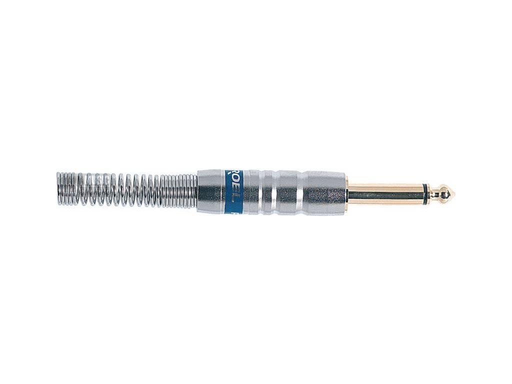Profesionální Jack 6,3 mm, zlacené kontakty, mosazné, poniklované tělo s ochrannou pružinou na kabel.