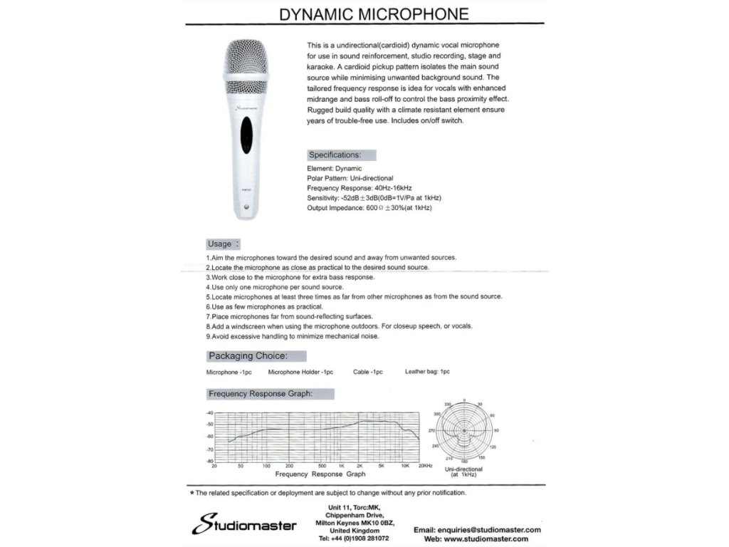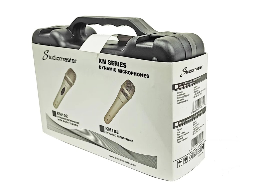 Kvalitní profesionální dynamický mikrofon Studiomaster s kardioidní charakteristikou, vhodný pro zpěv i nástroje. Masivní celokovové tělo a mřížka s vypínačem na těle mikrofonu. Součástí balení je i měkká taštička + plastový kufřík, držák mikrofonu se závitem na stojan a XLR/XLR kabel 5 m.