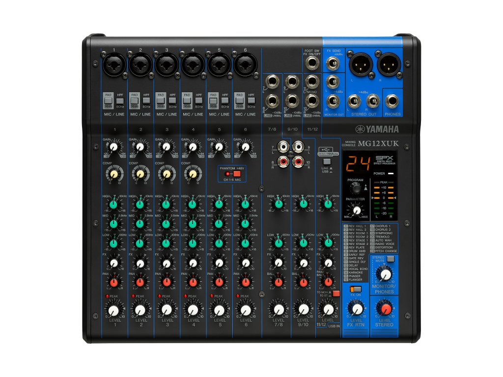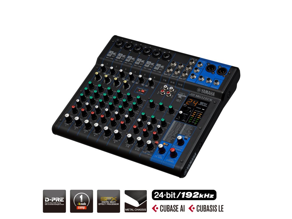 12-kanálový mixážní pult: Maximálně 6 mikrofonní / 12 linkových vstupů (6 mono + 3 stereo) / 1 stereo sběrnice / 1 AUX (včetně FX)