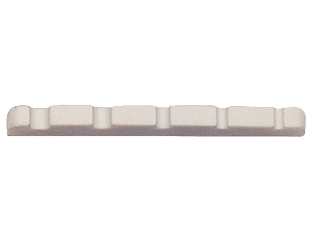 Nultý pražec pro 5-ti strunnou baskytaru plastový bílý, 45,0 x 3,5 x 5,8/4,5 mm.