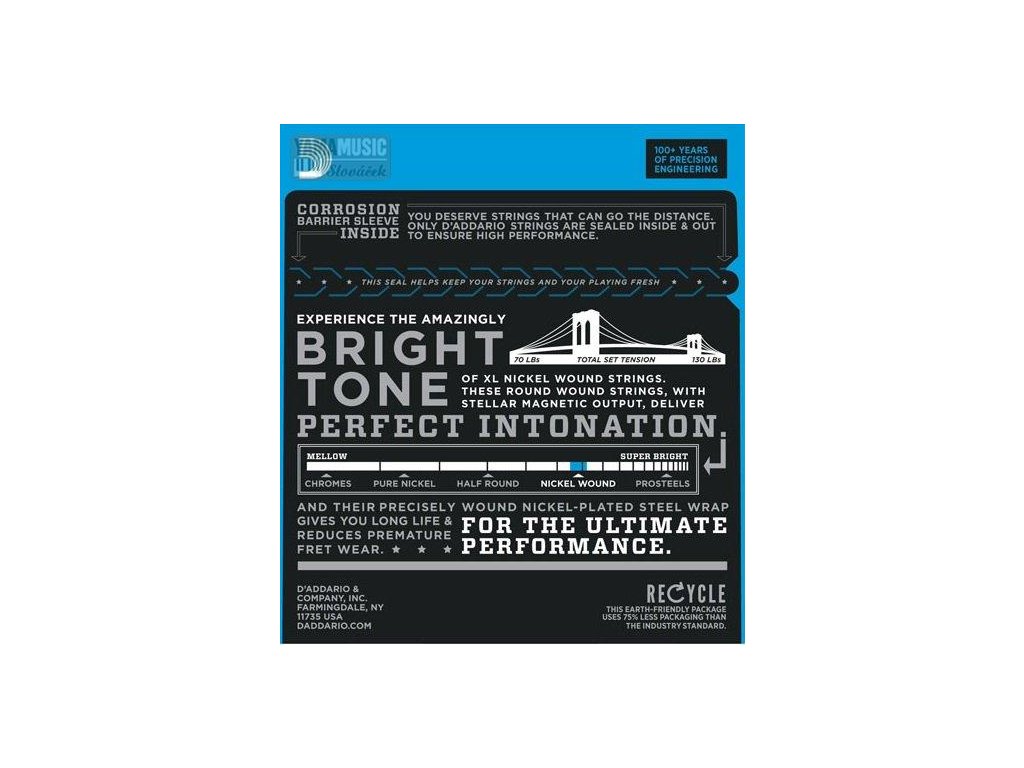 Struny z řady XL Nickel Wound jsou těmi nejoblíbenějšími v nabídce D’Addario. Vyrobeny jsou z oceli potažené niklem na velmi pečlivě vyrobeném šestihranném ocelovém jádru. Ve výsledku nabízí dlouhou životnost, specifický jasný tón a perfektní intonaci. Jde tak o struny velmi všestranné.