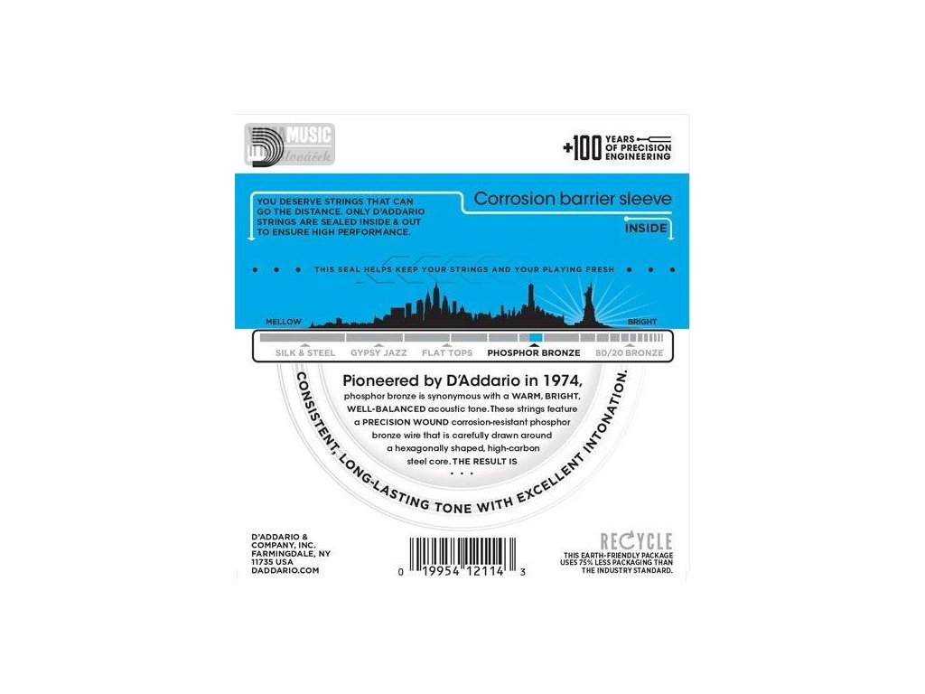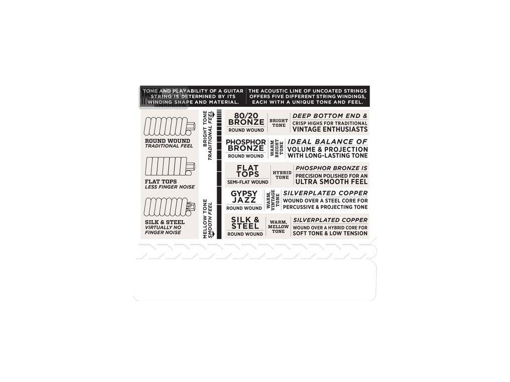 Struny z řady Phosphor Bronze Wound určené pro akustické nástroje byly představeny už roku 1974 a od té doby patří mezi ty nejoblíbenější mezi kytaristy a baskytaristy po celém světě. Jsou de facto synonymem pro teplý, ale jasný dobře vyvážený přirozený zvuk. Jejich vinutí je z korozi odolného fosforového bronzu, šestihranné jádro je pak tvořeno Ocelovéí s vysokým obsahem uhlíku. Nabízí tak dlouhou životnost, excelentní intonaci a nádherný tón.