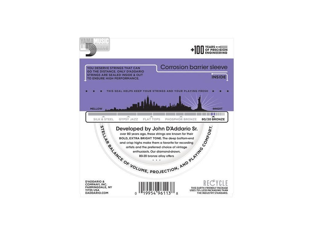 Struny z řady 80/20 Bronze Wound určené pro akustické nástroje využívají originální mosaznou slitinu, s kterou John D’Addario začal pracovat již v 30. letech minulého století. Jsou velmi oblíbené pro svůj velmi jasný, pevný a silný tón, který oceníte ve studiu či jako kytaristé vyznávající vintage tón a starší hudební žánry. Jádro je zde tradičně ocelové šestihranné pro dlouhou životnost, excelentní intonaci a bezvadný tón.