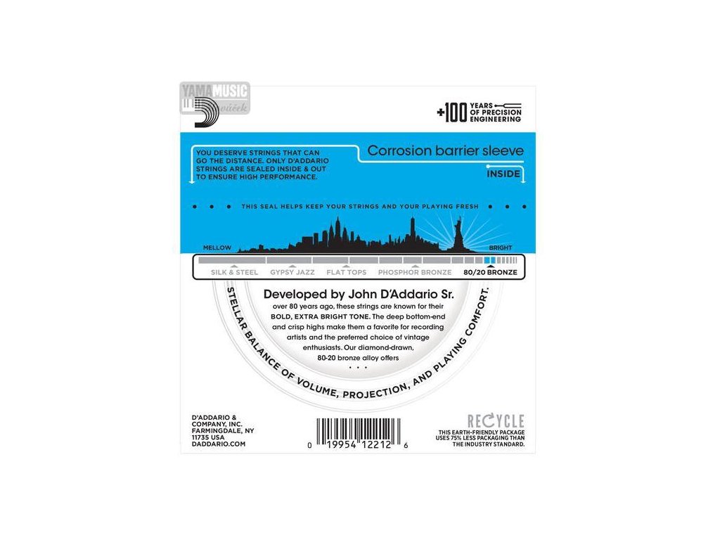 Struny z řady 80/20 Bronze Wound určené pro akustické nástroje využívají originální mosaznou slitinu, s kterou John D’Addario začal pracovat již v 30. letech minulého století. Jsou velmi oblíbené pro svůj velmi jasný, pevný a silný tón, který oceníte ve studiu či jako kytaristé vyznávající vintage tón a starší hudební žánry. Jádro je zde tradičně ocelové šestihranné pro dlouhou životnost, excelentní intonaci a bezvadný tón.