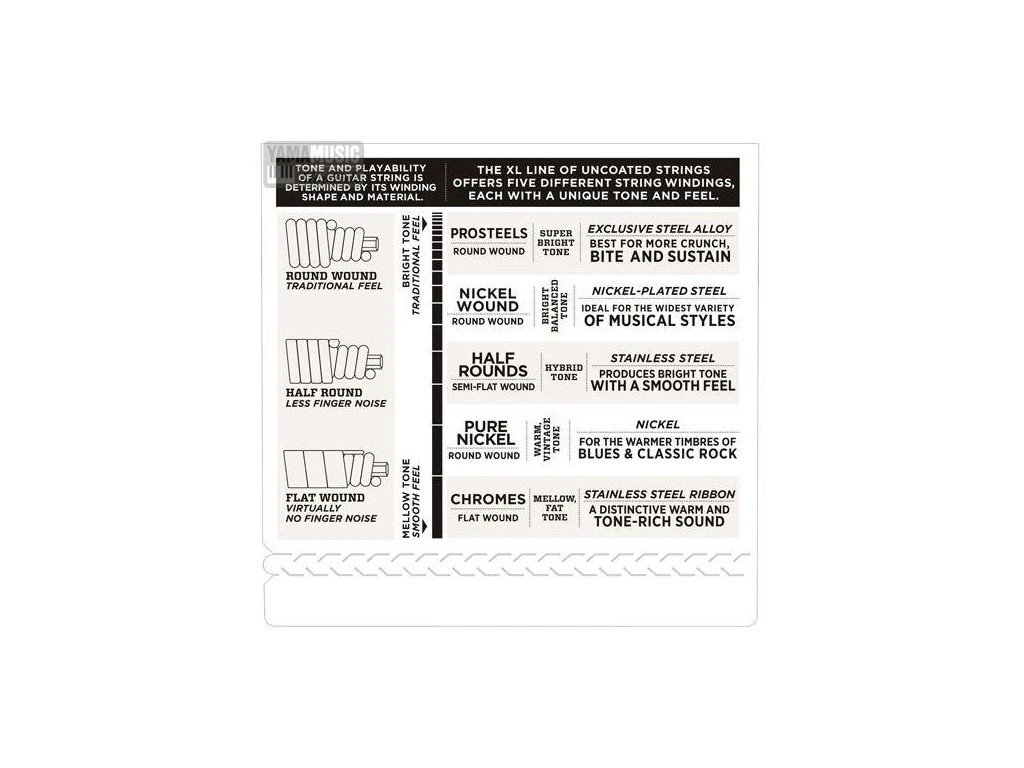 Struny z řady XL Nickel Wound jsou těmi nejoblíbenějšími v nabídce D’Addario. Vyrobeny jsou z oceli potažené niklem na velmi pečlivě vyrobeném šestihranném ocelovém jádru. Ve výsledku nabízí dlouhou životnost, specifický jasný tón a perfektní intonaci. Jde tak o struny velmi všestranné.