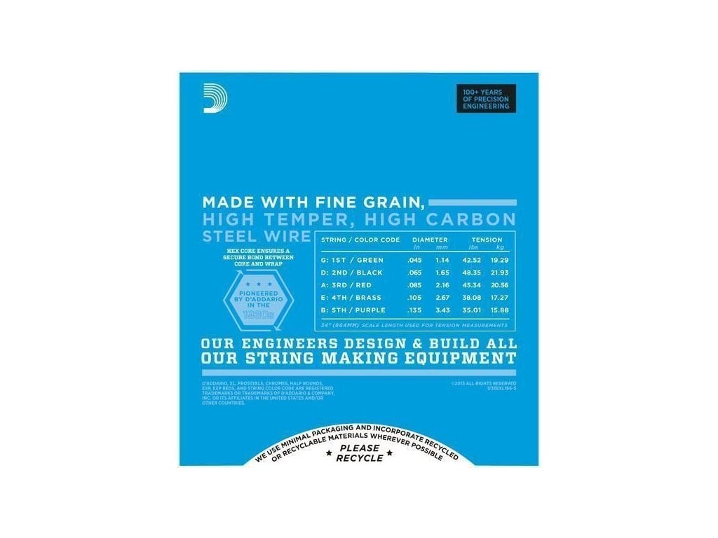 D'Addario EXL165-5 je oblíbená hybridní sada 5strunných basových strun, která kombinuje lehčí horní struny pro svižnou odezvu a artikulaci se silnější spodní částí pro plný, hutný bas. Pokud milujete hratelnost standardní sady .045–.105, ale potřebujete stabilní a čitelný nízký tón B, EXL165-5 je přesně pro vás.