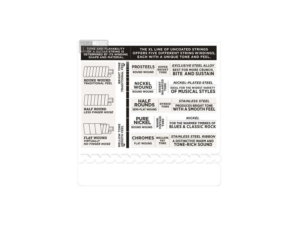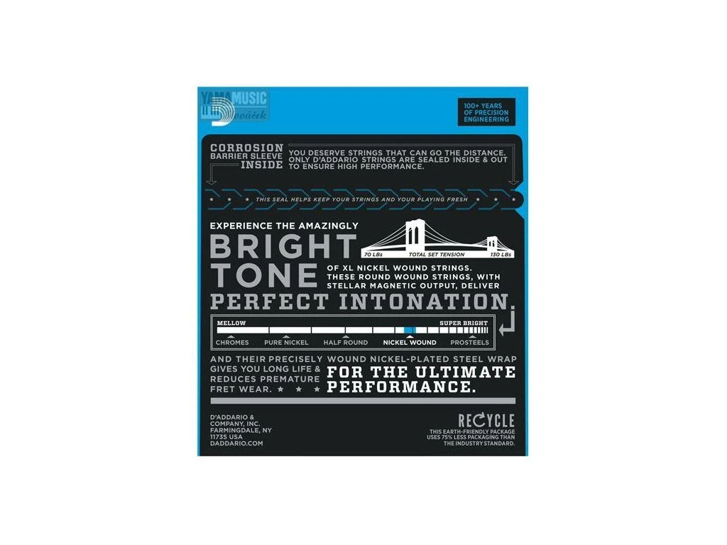 Struny z řady XL Nickel Wound jsou těmi nejoblíbenějšími v nabídce D’Addario. Vyrobeny jsou z oceli potažené niklem na velmi pečlivě vyrobeném šestihranném ocelovém jádru. Ve výsledku nabízí dlouhou životnost, specifický jasný tón a perfektní intonaci. Jde tak o struny velmi všestranné.