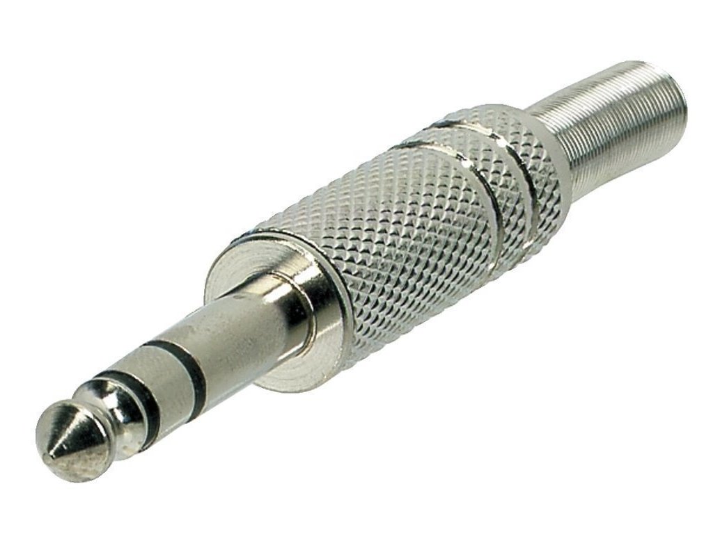 Jack 6,3 mm, stereo, poniklovaný, kovové pouzdro s pružinou pro kabel o průměru 6 mm.